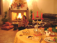 お客様には、サロンで暖炉にあたりながら、読書やおしゃべりなどしてリラックスして頂き、また特性ハーブティ、ワインなどを楽しみながら衛星テレビも見て頂けます。